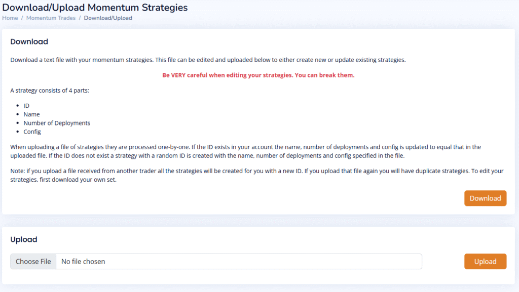 This section enables users to export their momentum trading strategies as a json file. Please note that exporting your strategies here will not remove your existing strategies.