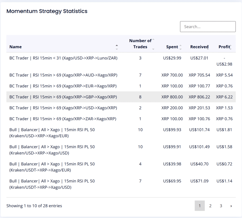 3. The table provides a comprehensive summary of your momentum strategy statistics, including the number of times each strategy was executed, the amount spent, the amount received, and the resulting profit.