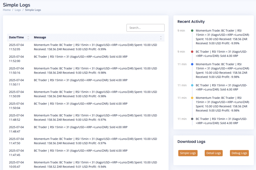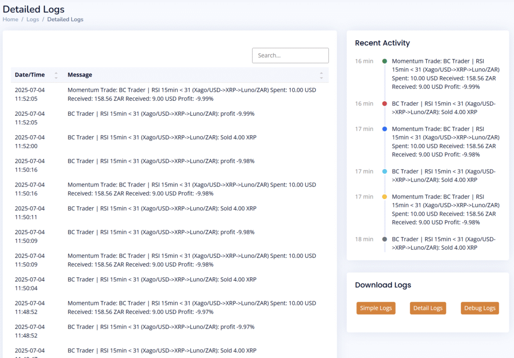 The Logs section allows you to view both simple and detailed records of your trades, including any error messages. Each log entry displays a message along with the date and time of the trade. You can review the logs directly on the screen or download them as a CSV file for further analysis.